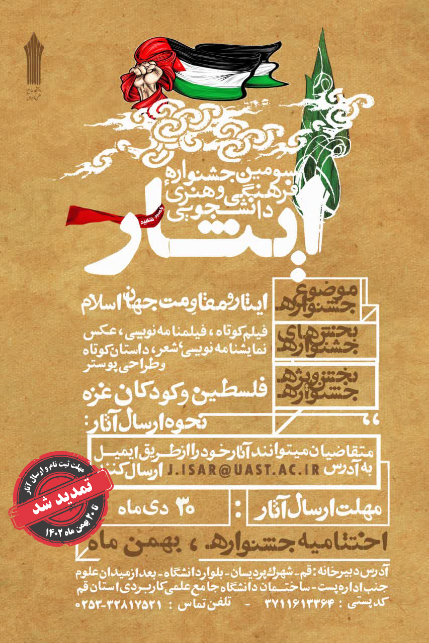 سومین جشنواره ایثار دانشجویی با محوریت ایثار و مقاومت در جهان اسلام در دو بخش هنری و ادبی و در 7 رشته: