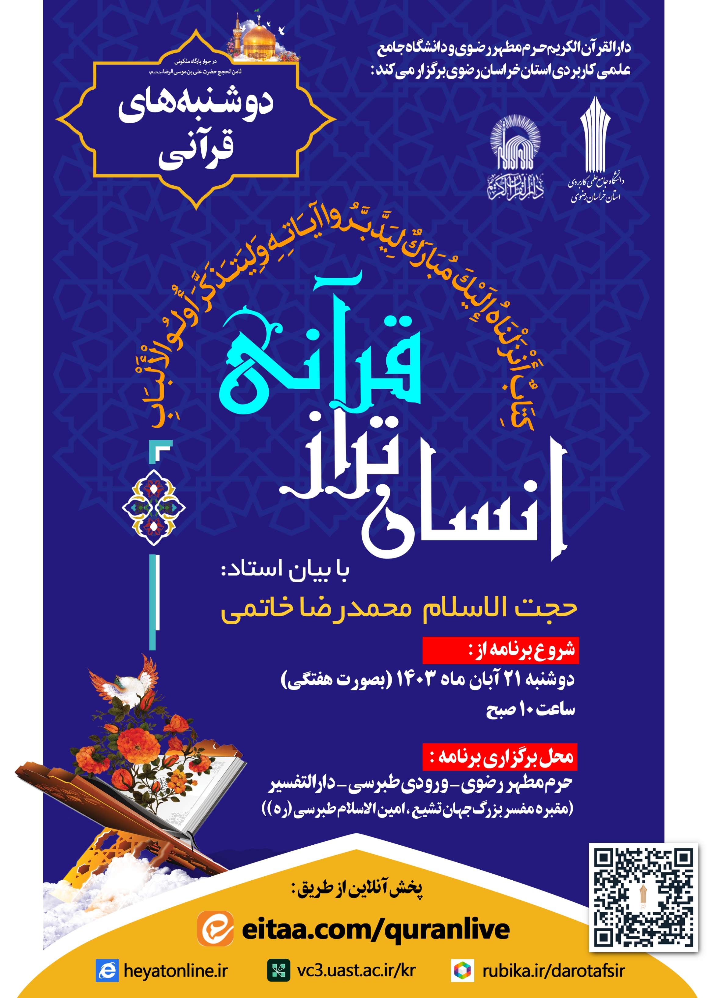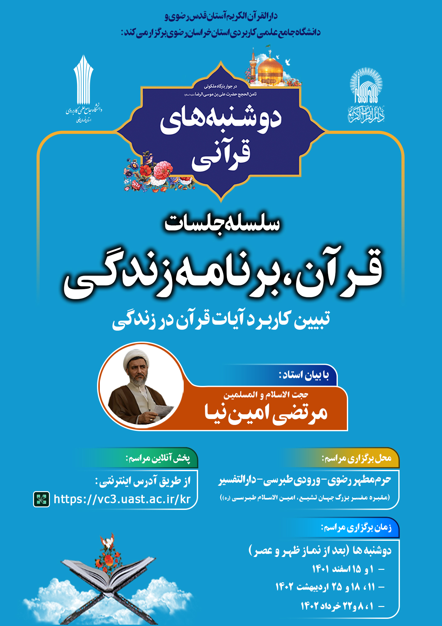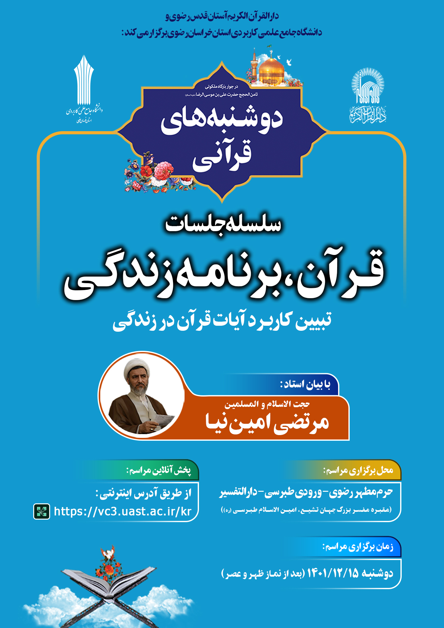 - موضوع برنامه: قرآن، برنامه زندگی (تبیین کاربرد آیات قرآن در زندگی)