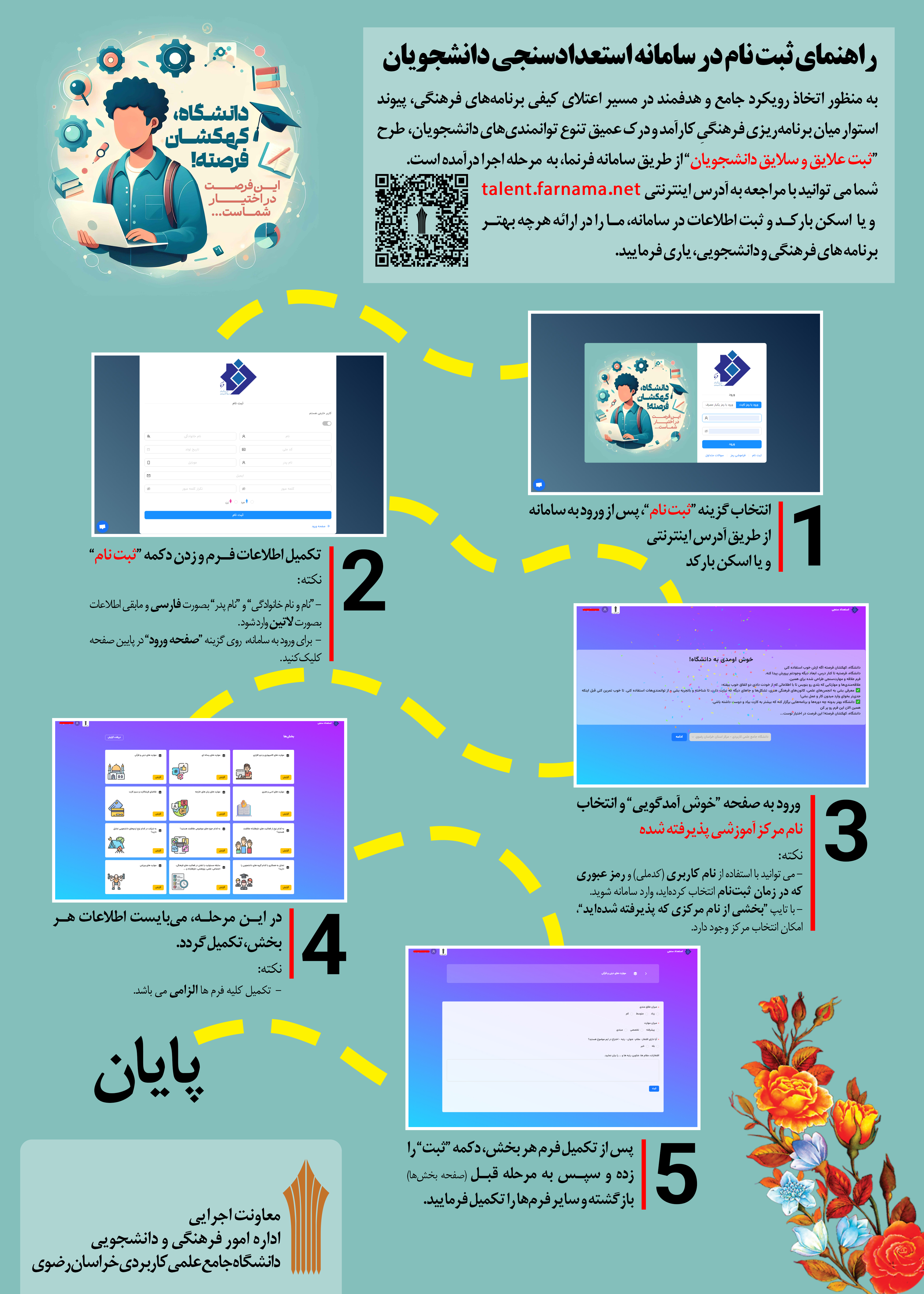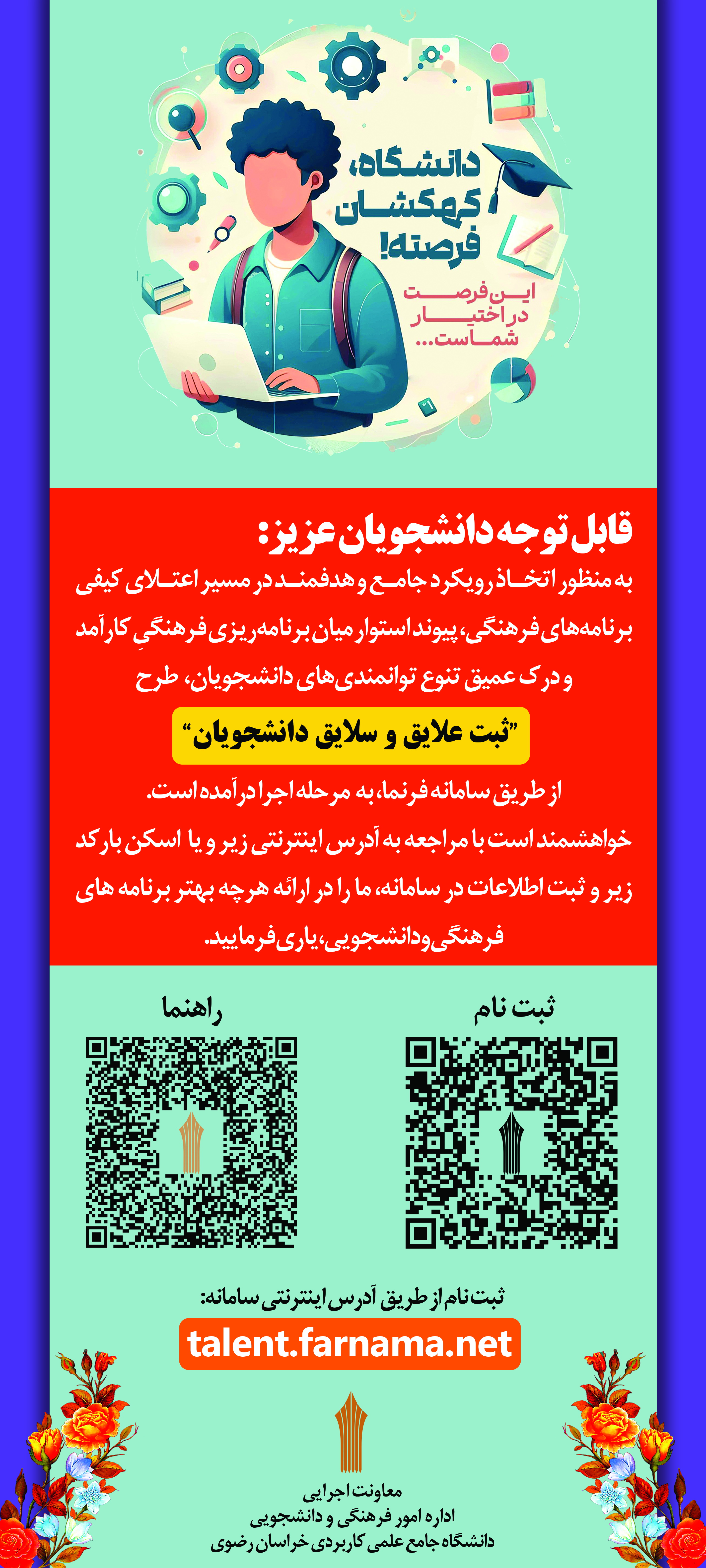 خواهشمند است با مراجعه به آدرس اینترنتی talent.farnama.net و یا اسکن بارکد زیر و ثبت اطلاعات در سامانه، ما را در ارائه هرچه بهتر برنامه های فرهنگی و دانشجویی، یاری فرمایید.